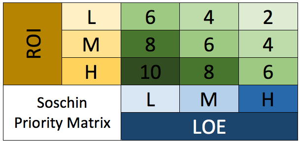 At this point, each task should now have a value of 2, 4, 6, 8, or 10. This is the project’s SPF (Soschin Priority Factor). You’re now much closer to a ranked list of tasks, but you’ve also probably noticed that some are colliding with one another, in that a medium LOE with a high ROI (score=8) has the same value as low LOE and medium ROI (also score=8). That’s okay… keep reading.